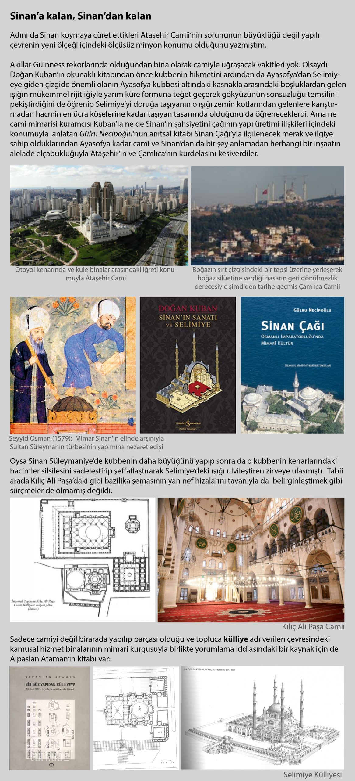 Neleri sembolize edip temsil ederlerse etsinler, Ayasofya son kertede bir bina, Sinan da inşa edildikten sonra Akdeniz inşaat kültürünün dönüm noktalarından olmuş bu binayı gelecekteki inşaat kültürüne maledip dönüm noktalığını tescillemiş bir mimardır. Günümüzün İstanbul’u devamlı fethetme arzusu da hazımsızlık..