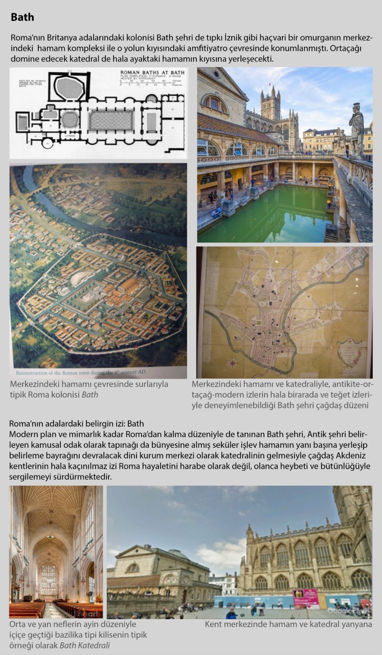 Konstantin İstanbul’u inşa edene kadar Roma rakipsiz, emsalsiz bir şehirdi. Ama Romalılar egemenlikleri altındaki Akdeniz coğrafyasına hep benzeri şemalarla şehirler kurarak egemenliklerini sürdüler. Örnekleyeceğim İznik imparatorluğun merkezi Marmara’da; Bath Britanya’da aynı kalıpla benzer ölçülerle kurulmuş şehirlerdi.