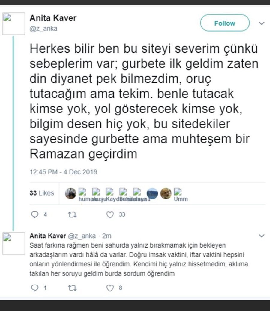 Hattâ Anita’nın attığı bir tivit ve ona verilen cevaplar Onedio sitesinde de “Twitter’dan Anita Kaver ilk sabah namazı kıldığı sırada yaşadıklarını anlattı, takipçilerinden de birbirinden güzel paylaşımlar geldi. İşte o anılar… “ başlığıyla yer almıştı.https://oned.io/h/889829