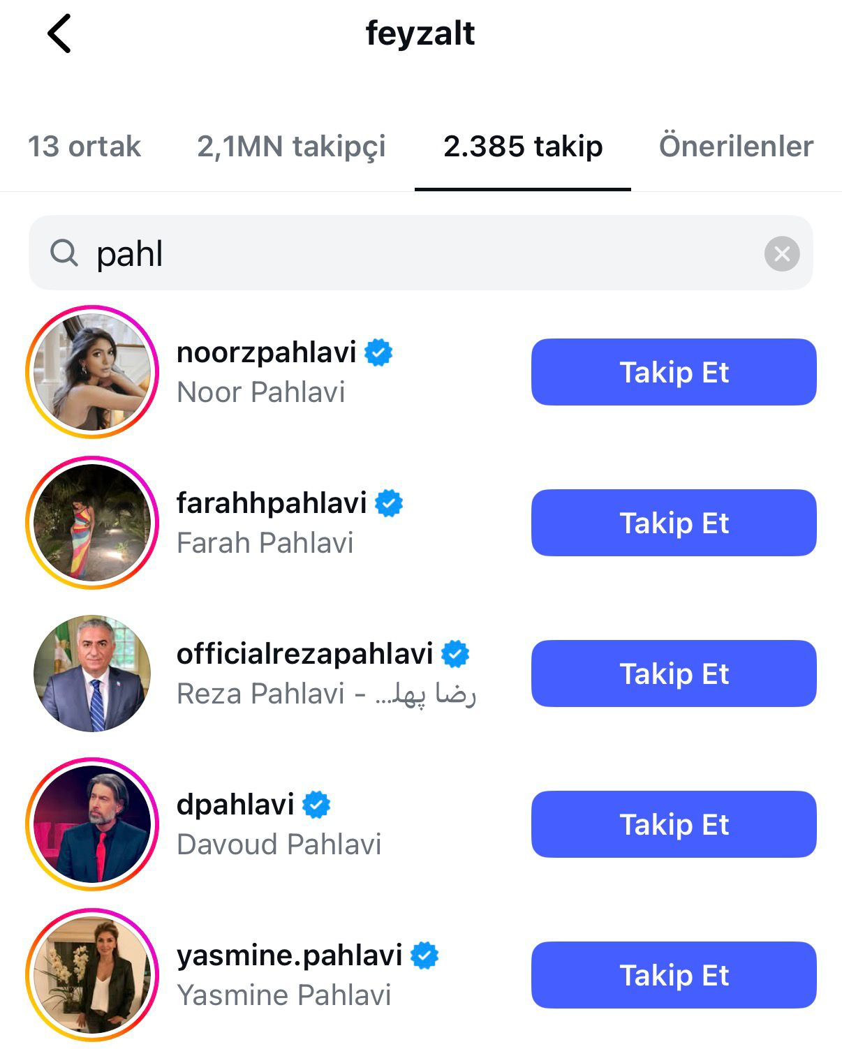 1979 İslam Devrimi ile devrilen İran Kraliyet Ailesi’nin (Pehlevi Hanedanı) önde gelen üyelerini Instagram hesabından takibe aldı.