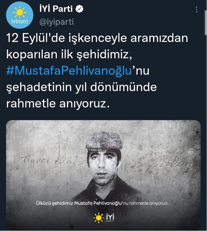 İyi Parti’nin dün (7 Ekim) Twitter hesabından yaptığı paylaşımda, 1978 yılında üç kahveyi tarayarak beş kişinin ölümüne sebep olduğu iddiasıyla 12 Eylül darbesinin ardından idam edilen Mustafa Pehlivanoğlu’nu andı. Anmaya tepkiler geldi.