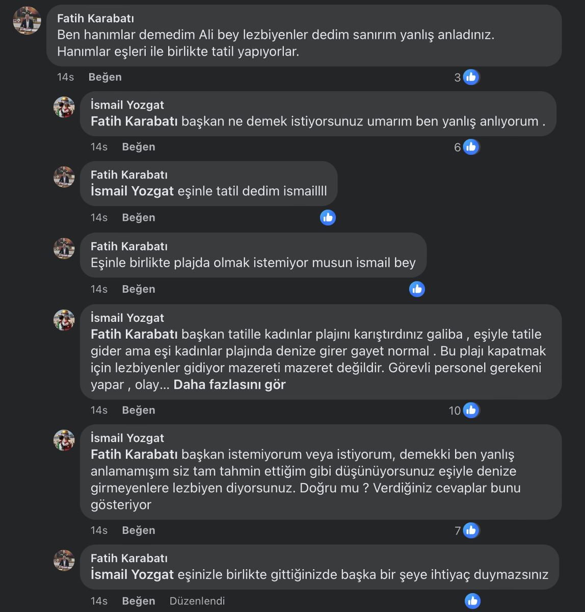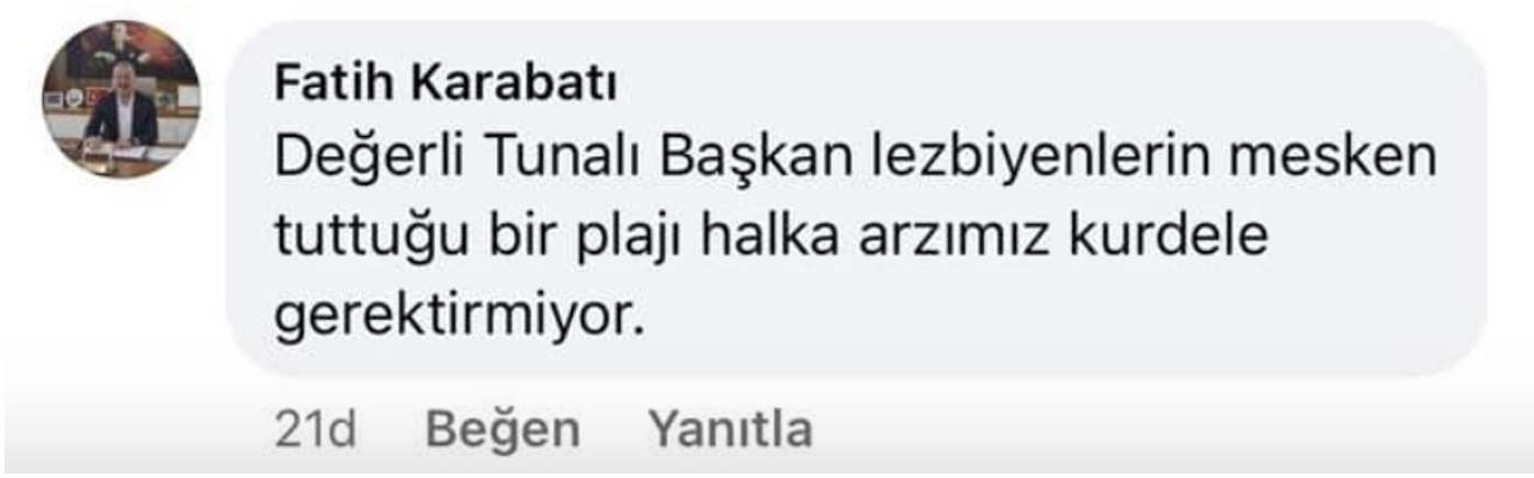 Başkan Karabatı, Facebook’ta yaptığı bir yorumda, plajın kapılmasını “Lezbiyenlerin mesken tuttuğu bir plaj” diyerek savundu.