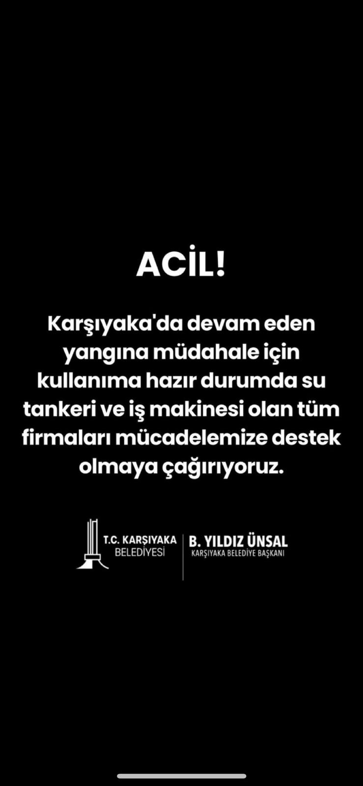 Karşıyaka Belediyesi de dayanışma çağrısında bulundu. Belediyeden yapılan açıklamada, “İlçemizde devam etmekte olan yangına tüm ekiplerimizle hızlı bir şekilde müdahale ediyor, gelişmeleri anlık takip ederek gereken tüm önlemleri alıyoruz. Ekiplere destek olmak için su, kumanya ve ayran getirmek isteyen vatandaşlarımız, malzemeleri ana hizmet binamıza bırakabilir” denildi.