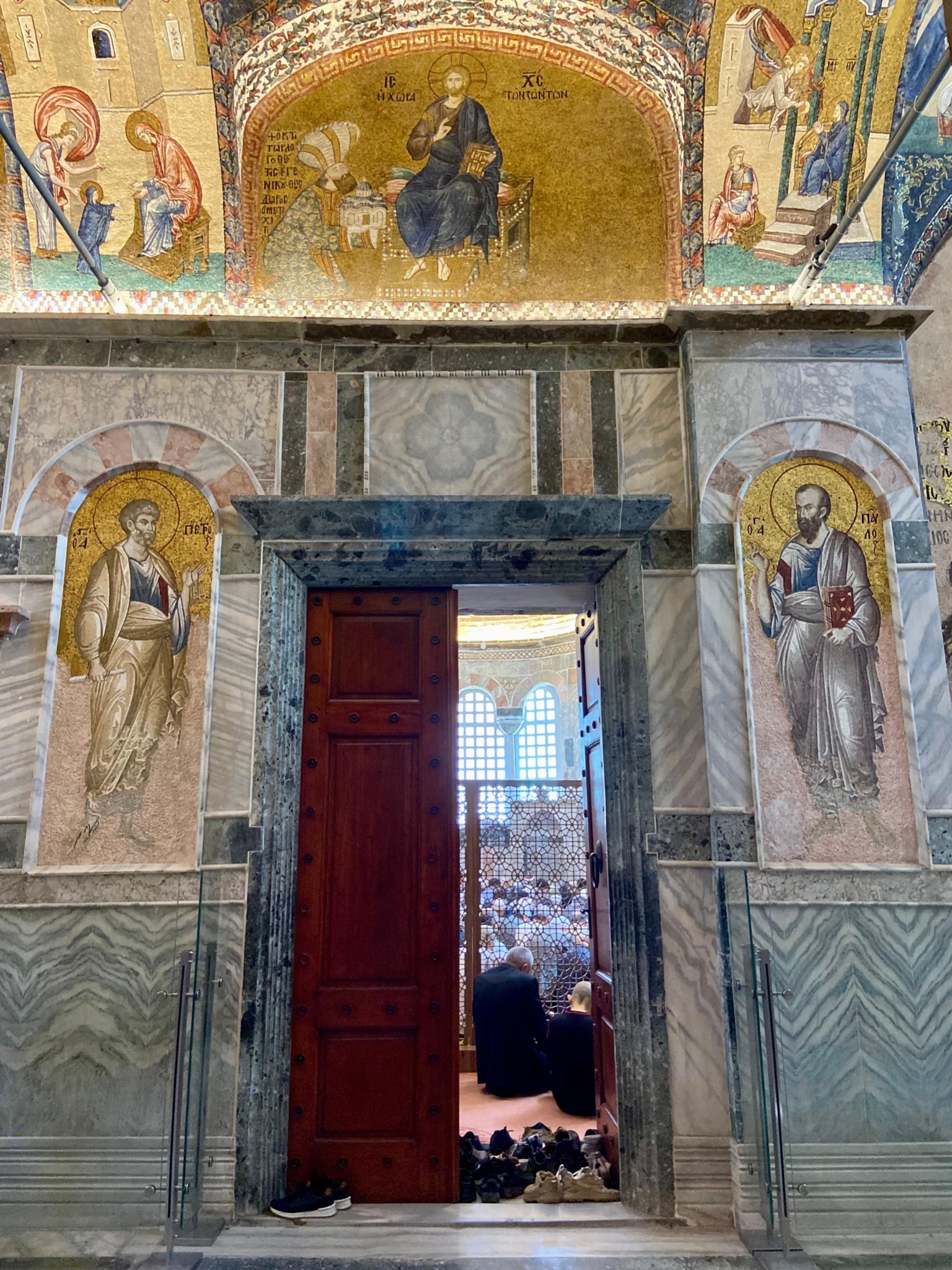 Kariye’de sadece bu bölümde minberin ve kürsünün yanındaki iki resmin ve kapının üzerindeki bir resmin üzeri yapıyla uyumlu şekilde perdelerle kapatılmış. Dolayısıyla yapının bu kısmı müze kısmından çok farklı ve sade görünüyor.