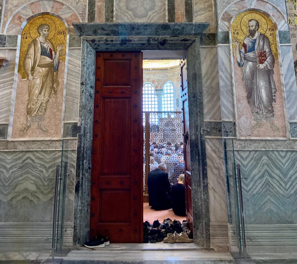 Hz. İsa’nın ekmek, balık ve şarap mucizelerini, Lucifer’in Hz. İsa’yı günaha davet etmesini, kilisenin kurucuları olan azizleri tasvir eden fresk ve mozaikler arasından geçerek ibadete açılan bölüme doğru gidiyoruz. Namaz kılınan bölüme bir adım geriden bakıldığında cemaat ve freskler iç içe geçmiş gibi gözüküyor. Bu noktada ortaya alışılmışın dışında bir görüntü çıkıyor. Cemaat oldukça kalabalık. Açılışın heyecanıyla Kariye’de namaz kılmak isteyen cemaat camiyi doldurmuş durumda.