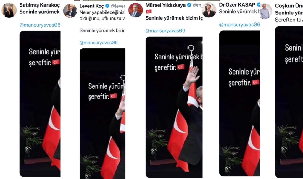 Ankara’daki ilçe belediye başkanları “Seninle yürümek bizim için şereftir.” notuyla Mansur Yavaş’ın Türk bayrağı önündeki fotoğrafını paylaştı.