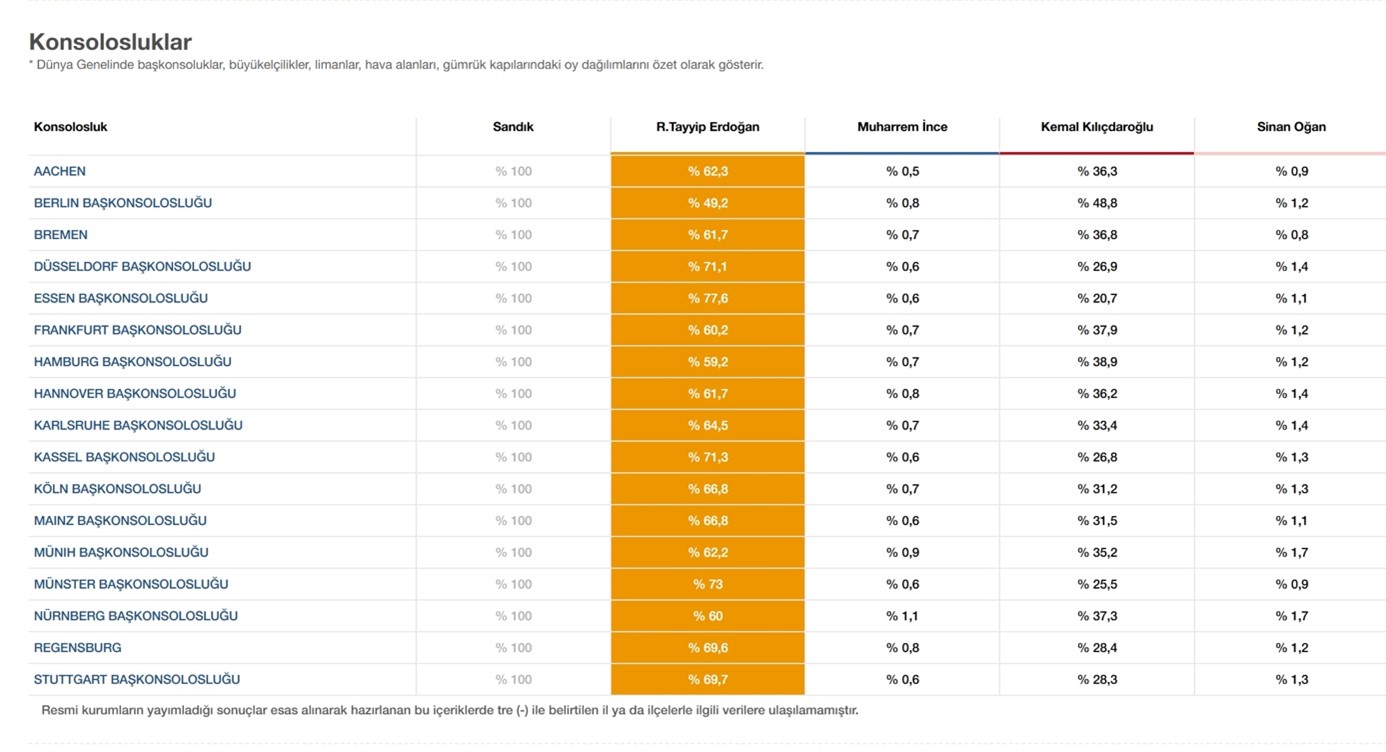 2023 Cumhurbaşkanlığı seçiminin 1’inci turunda Almanya konsolosluklarundaki oy dağılımı.