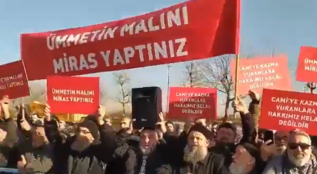 Eylemde cemaat üyeleri “Camiye kazma vuranlara hakkımız helal değildir” ve “Ümmetin malını miras yaptınız” sloganları attı.