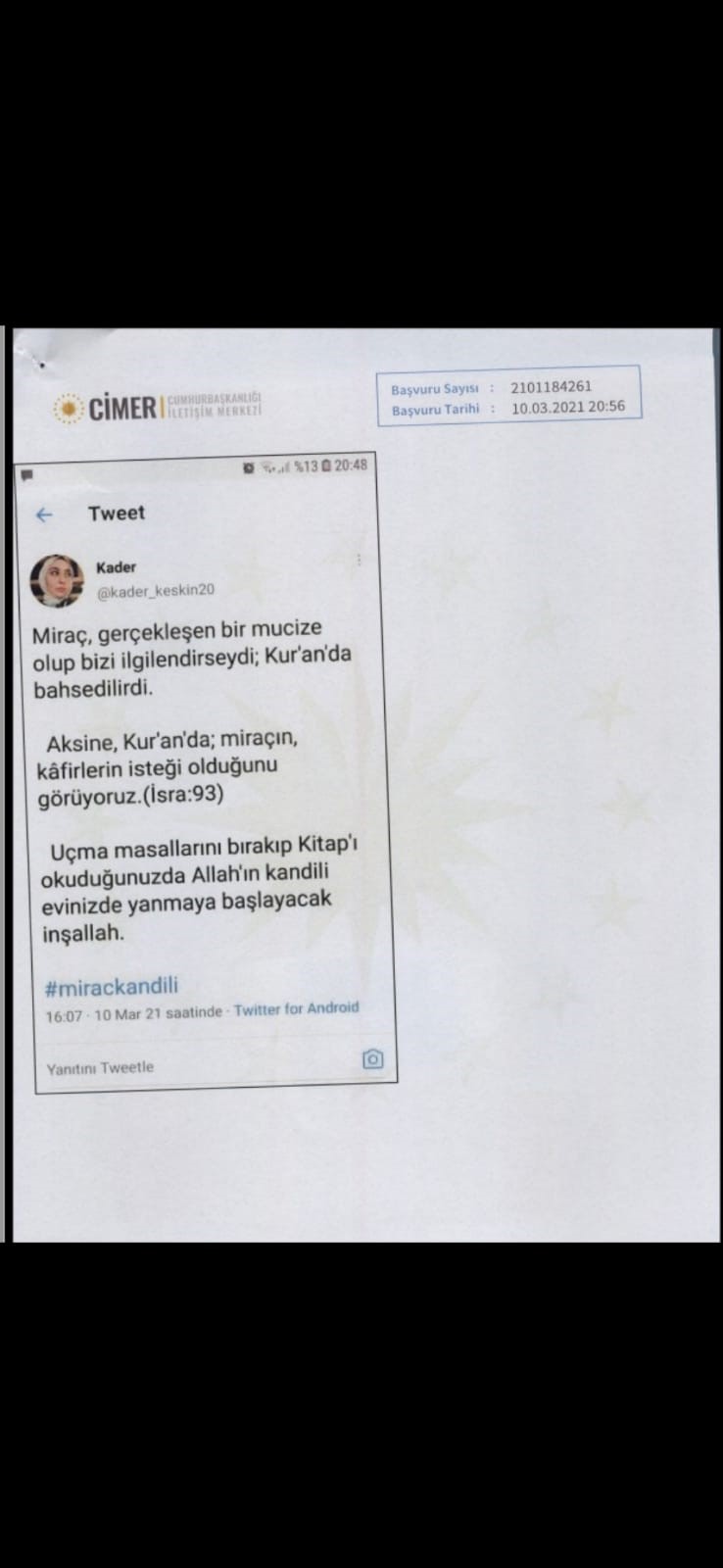 “Miraç hakkında attığım tweet yüzünden CİMER’e şikâyet edilmişim. Okumuş olduğum fakülte tarafından hakkımda soruşturma açılmış. Sırf namaz kılmadığımı ifade ettim diye toplumda olumsuz duygular oluşturuyormuşum, sarf etmediğim bir ifade üzerinden de sorular sorular… Hayırlısı.”