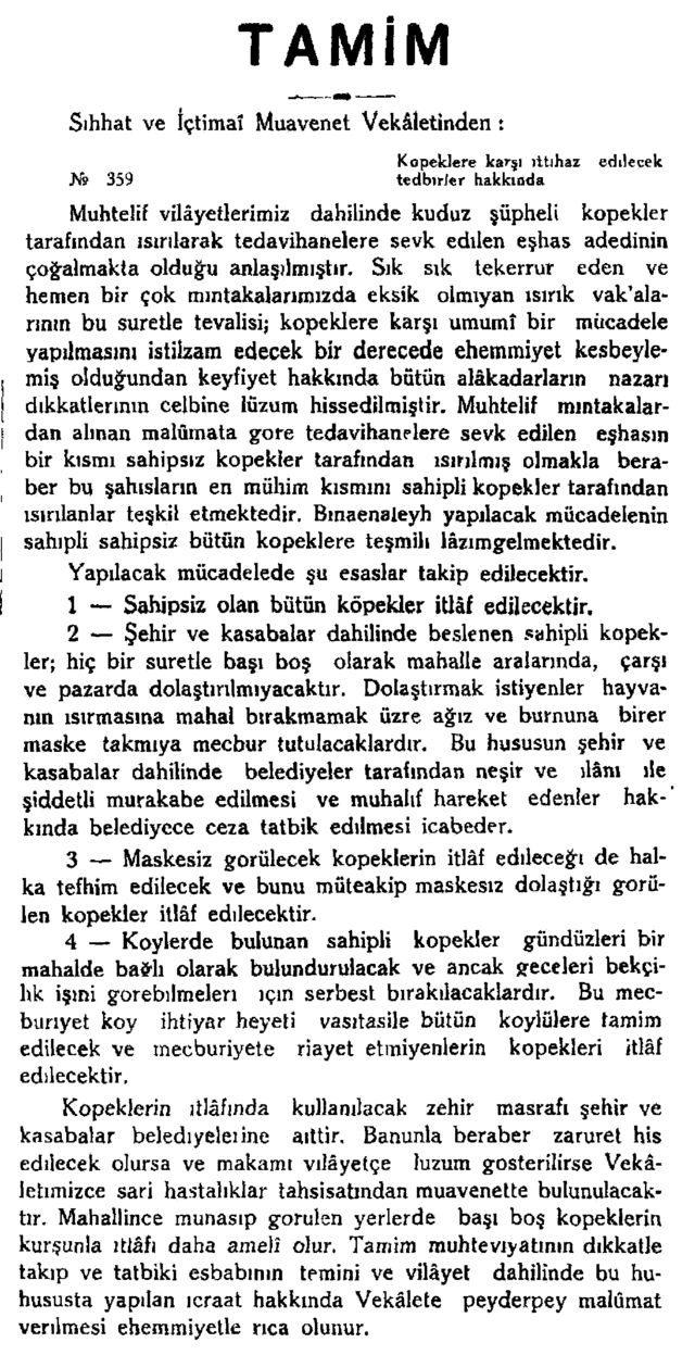 Geçmişte sokak köpekleri meselesinin halli için alınan fakat bugünkü vaziyete bakıldığında işe yaramadığı anlaşılan, pek telâffuz edilmeyen ve dolayısı ile az bilinen bir başka karar daha var: Eski ismi “Sıhhat ve İçtimaî Muavenet Vekâleti” olan Sağlık ve Sosyal Yardım Bakanlığı’nın Resmî Gazete’de 13 Haziran 1932’de, yani Atatürk’ün cumhurbaşkanlığı döneminde yayınladığı “Köpeklere karşı alınacak tedbirler hakkında” başlıklı “tamim”i, yani genelgesi…