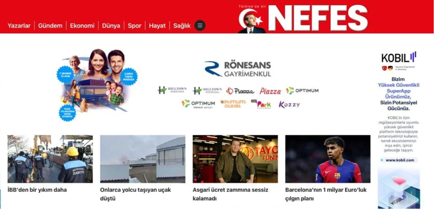 “10 gün boyunca sitenin tepesinde sadece bir tek reklam vardı: Rönesans Gayrimenkul Şirketi. İkincisi yok! Şu bizim meşhur Saray’ı ve daha nice büyük inşaatları yapan büyük müteahhitlik şirketi… Tayyipgillerin en yakın güvenilir unsuru. Nefes ise Atatürkçü, laik Cumhuriyet’ten yana bir gazete. Rönesans’ın ne işi vardı orada! Yoksa gazetenin arkasındaki sermaye grubu acaba Rönesans mı idi! (Hemen bilgi vereyim, bu ilan dün siteden kaldırıldı.)”