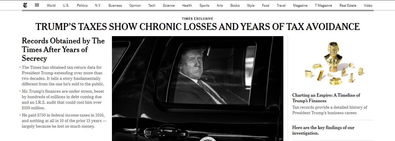 New York Times, Pazar günü okurlarının karşısına manşetten verdiği “Trump’ın vergileri kronik kayıplara ve yıllar boyu vergi kaçırmaya işaret ediyor” haberiyle çıktı.
