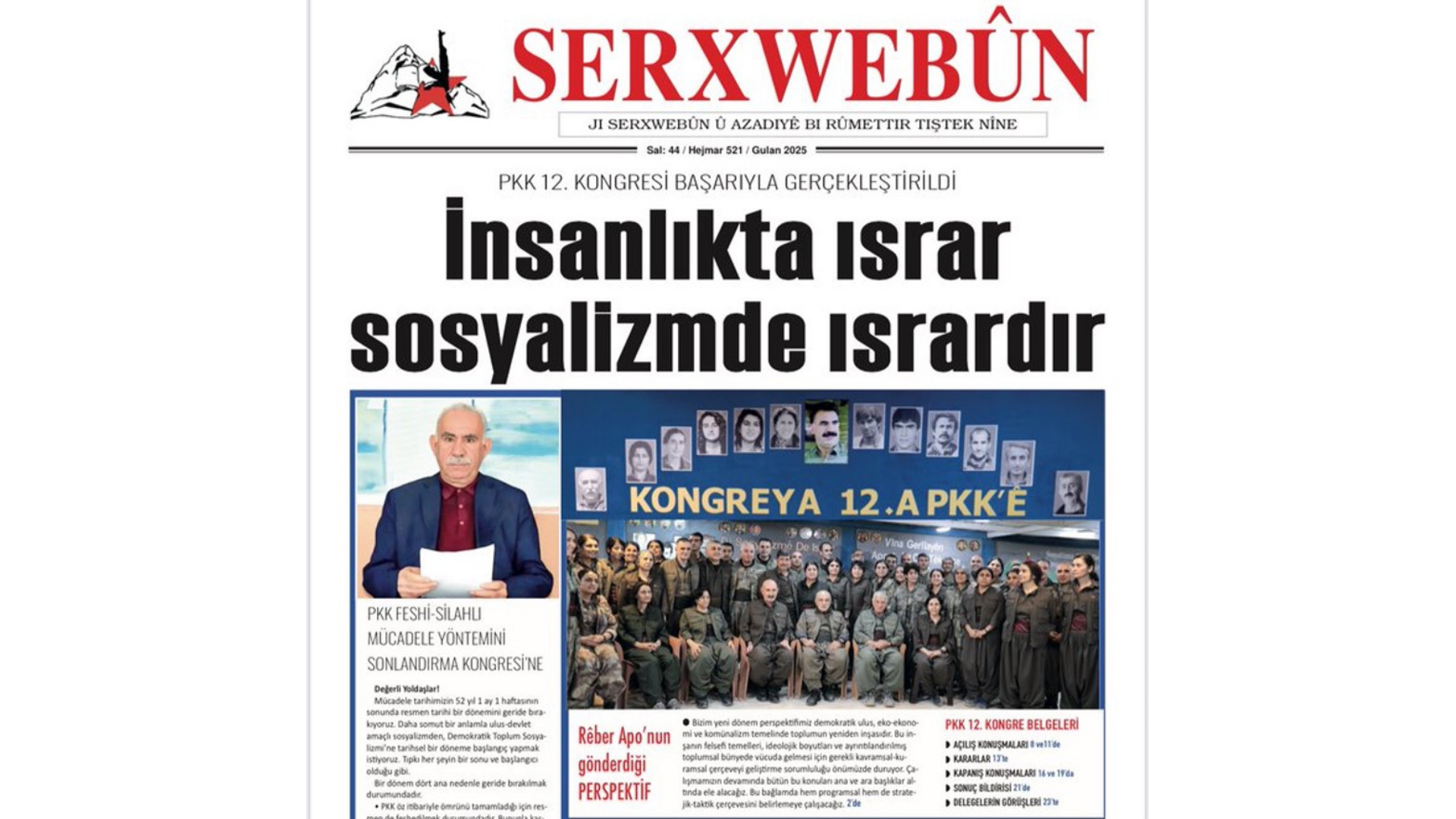 Değerli Yoldaşlar! Mücadele tarihimizin 52 yıl 1 ay 1 haftasının sonunda resmen tarihi bir dönemini geride bırakıyoruz. Daha somut bir anlamla ulus-devlet amaçlı sosyalizmden, demokratik toplum sosyalizmine tarihsel bir döneme başlangıç yapmak istiyo- ruz. Tıpkı her şeyin bir sonu ve başlangıcı olduğu gibi. Bir dönem dört ana nedenle geride bırakılmak durumundadır. w PKK öz itibariyle ömrünü ta- mamladığı için resmen de feshe- dilmek durumundadır. Bununla kas- tedilen reel-sosyalizmin iç nedenle çözülüşü, yeni bir sosyalizm yolunun açılma gereği, Kürt kimliğinin ta- nınma ve gerçekleşme durumudur. w Silahlı mücadele; ulus-devlet amaçlı bir stratejiye dayalı olup bu amaçtan düşüş ve demokratik top- lum programına geçiş demokratik siyaset ve hukuka dayanmayı ge- rektirdiğinden vazgeçilmeyi gerek- tirir. Karşılığı demokratik siyaset hakkının tanınması ve sağlam bü- tünlüklü bir hukuki güvencedir. w Devletle her tür diyalog ve gö- rüşmeler PKK resmiyeti altında kabul görmediğinden önemli bir unsur olarak gündemleştiğinden fesih gereklidir. Kamuoyu dikkate alınarak varılan bir sonuç olarak da görülebilir. Yeni bir tarihi döneme; “Barış ve Demokratik Toplum” aşamasına geçiş için gereklidir. Hem içerik hem form olarak birinci dönemin alternatifi olarak kongrenin sonlan- dırma, demokratik toplum, onun si- yaseti ve hukukuna ilişkin alacağı kararların tarihi nitelikte olduğuna inanıyor ve başarmasını diliyorum. İnsanlıkta Israr Sosyalizmde Is- rardır. Ulus-devletçi sosyalizm yenilgiye; Demokratik toplum sosyalizmi za- fere götürür. 27 Nisan 2025 Abdullah ÖCALAN