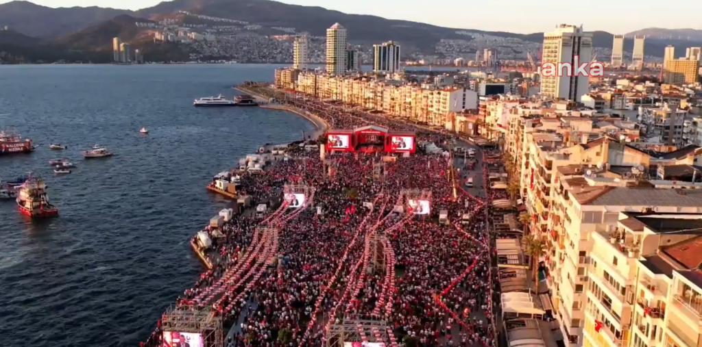 “19 Mayıs 2025, 19 Mart darbesinden 60 gün sonra Tayyip Erdoğan’a, ‘Bir aya kalmaz ortaya belgeler dökülünce birbirlerinin, ailelerinin yüzüne bakamayacaklar’ diyen Erdoğan’a Gündoğdu Meydanı’ndan sesleniyorum. Burada iki milyonun üzerinde İzmirlinin gözünün içine baka baka söylüyorum, Ekrem Başkan ve arkadaşlarımız suçsuzdur. Hiçbir iftiranı kanıtlayamadın, hepsi yalan, hepsi iftira. Kaybedeceğin için yarışmaktan korkuyorsun, iftira atıyorsun.