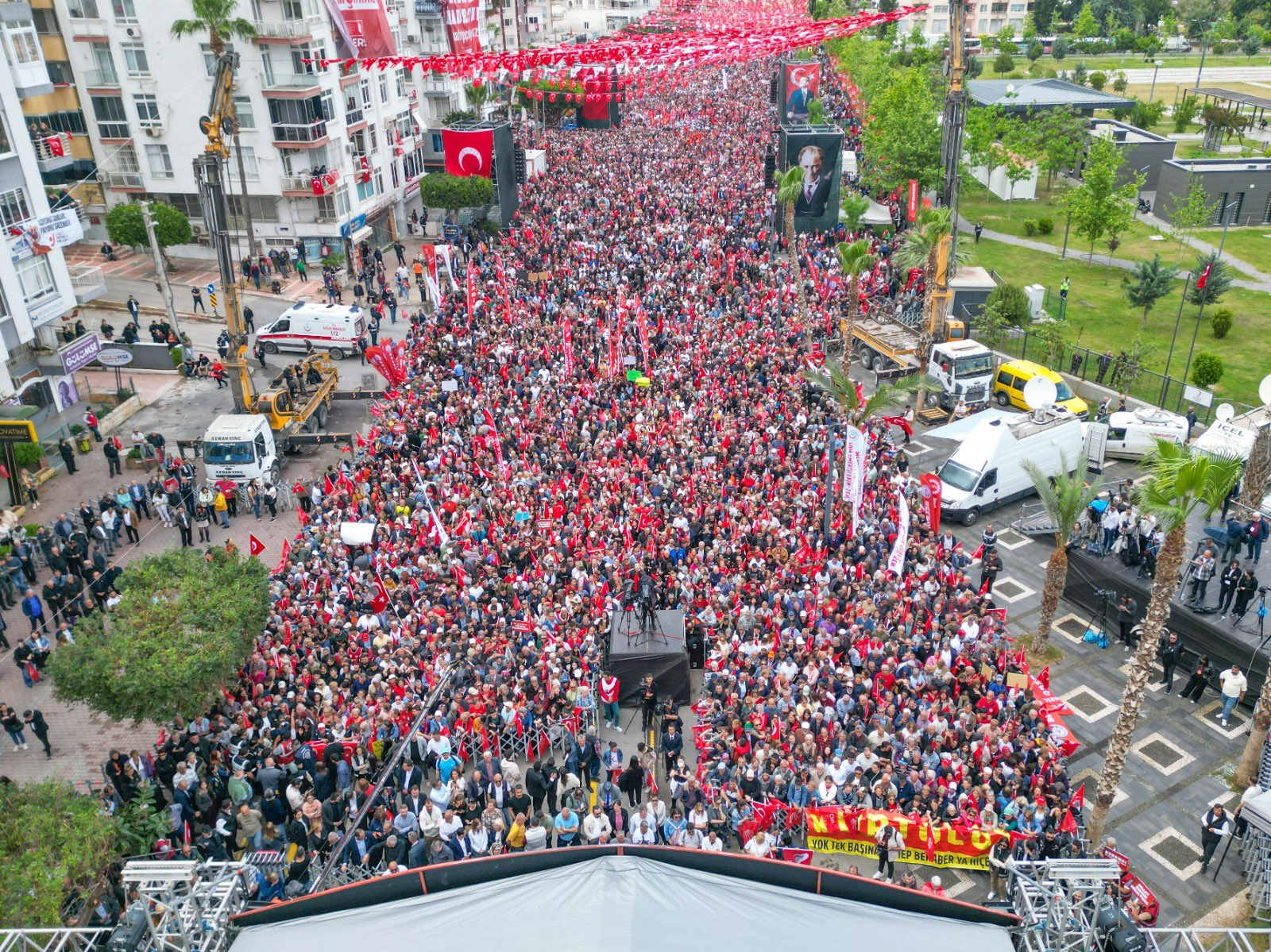“Drone kalabalığın ucuna ulaşamıyor. Mersin tarihin en büyük mitinglerinden birini yapıyor ama biz bugün Mersin’e miting yapmaya değil eylem yapmaya ve sonuç almaya geldik. Belediyeye yapılan, milli iradeye yapılan darbe girişiminden sonra meydanlara sığmayanlar bugün Mersin’de hep birlikte ‘İmamoğlu’na özgürlük’, ‘Adayımı yanımda, sandığı önümde istiyorum’ demeye geldiler. Nasıl ki 2019 öncesinde Mersin’de rant, kavga, mafya vardı, Vahap Seçer geldi, huzuru, hizmeti ve barışı getirdi. Bu nasıl olduysa gelecek seçimlerden sonra AK Parti gidecek, CHP gelecek, Türkiye’ye huzur ve barış gelecek. O huzuru getirecek olan isim ise bugün bizi küçücük hücresinden izleyen Ekrem İmamoğlu’dur.