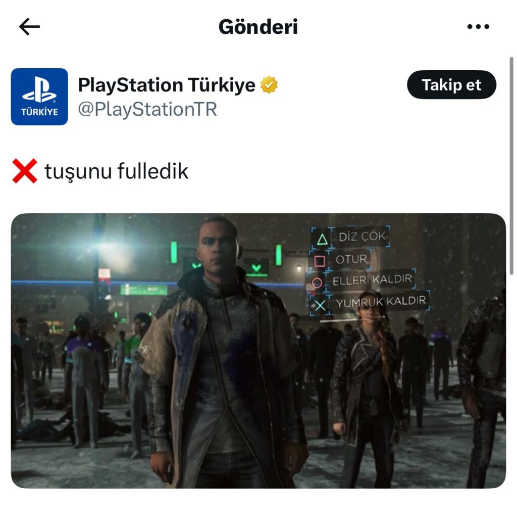 İBB Başkanı İmamoğlu’nun 19 Mart’ta gözaltına alınmasının ardından başta İstanbul, Ankara ve İzmir olmak üzere Türkiye’nin birçok kentinde kitlesel protesto gösterileri düzenlendi. PlayStation Türkiye’nin X hesabı, üniversitelilerin yoğun olarak katıldığı protesto eylemlerine gönderme olduğu düşünülen bir paylaşım yapıldı.