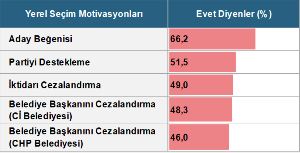 Rapora göre yerel seçimlerde en yaygın oy verme motivasyonu aday beğenisi oldu. Parti için oy verme, hükümeti veya belediye başkanını cezalandırma bu motivasyonu takip ediyor.