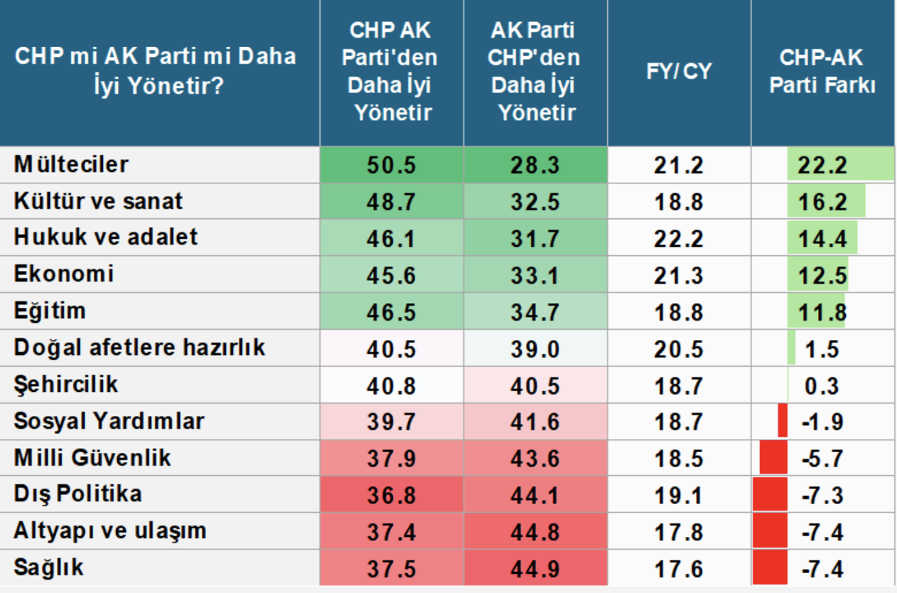 “CHP Türkiye’yi yönetebilir” fikri oluşuyor ancak halen çok kuvvetli değil. AK Parti’nin yönetebilirliğine güven ise düşüyor.