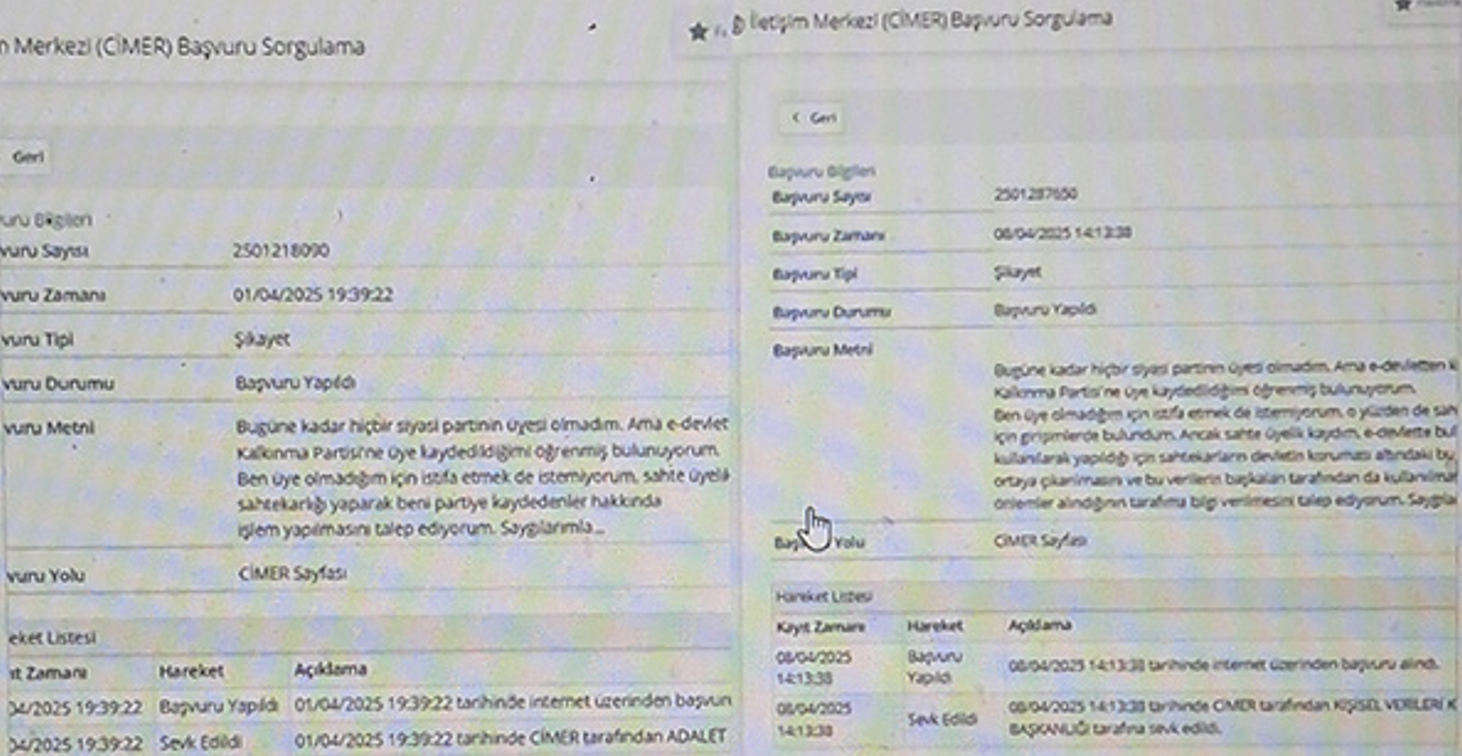 Bu konuda CİMER’e başvurmak da gerekiyor. Faruk Bildirici’nin CİMER üzerinden Adalet Bakanlığı ve Kişisel Verileri Koruma Kurumu’na yaptığı başvuru yukarıdaki fotoğrafta. Sosyal medyadaki açıklaması şöyle: