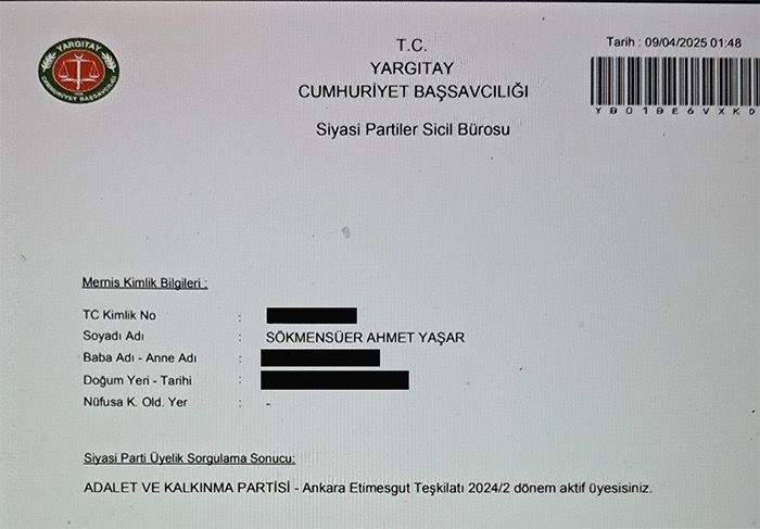 Üyelik tarihleri sahteciliğin devamlılığı açısından da mânâlı… Zira Bildirici Şubat 2022’den beri “Adalet ve Kalkınma Partisi – Ankara Etimesgut Teşkilatı’na aktif üye” görünüyor. Bizden iki yıl önce üye yapmışlar, yeni fark etmiş.