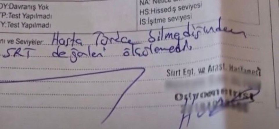 Muayeneyi gerçekleştiren doktor, test için hazırlanan evraka “Hasta, Türkçe bilmediğinden SRT değerleri ölçülemedi” şeklinde not düştü. Doktor, Sümeli’nin farklı bir hastaneye götürülmesini tavsiye etti.