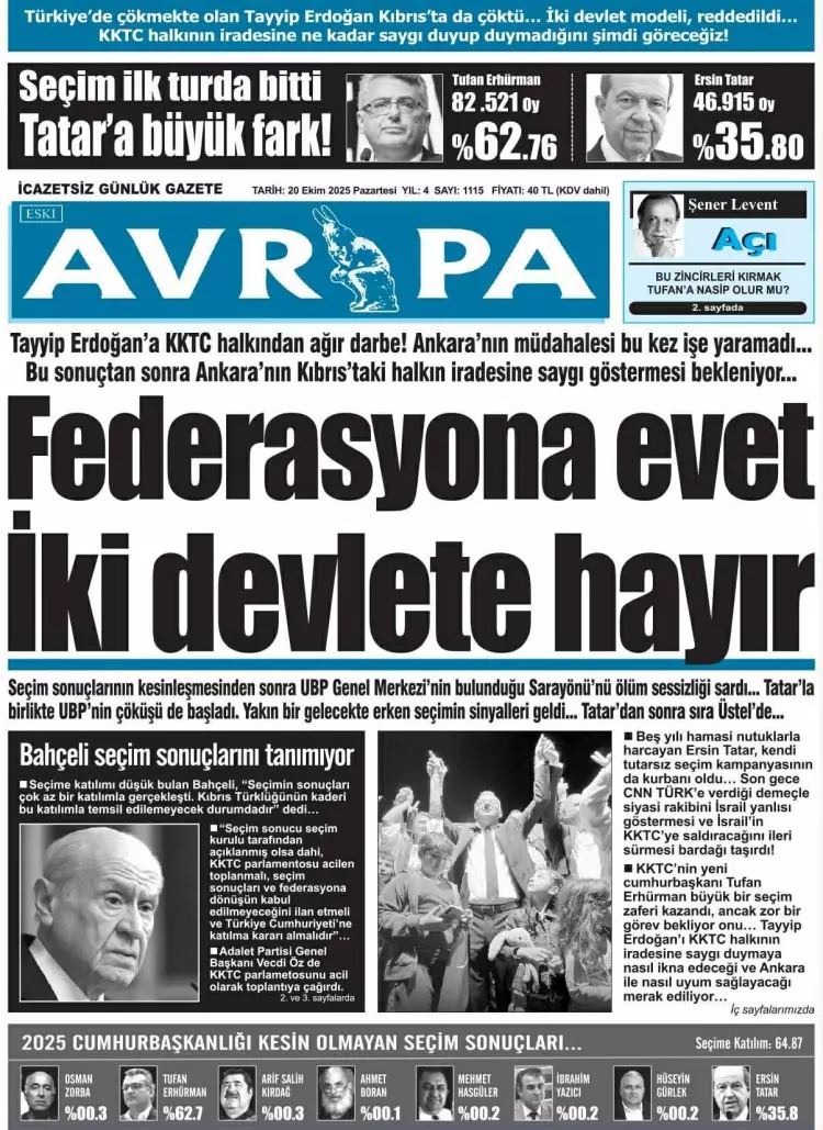 Avrupa: Tayyip Erdoğan’a KKTC halkından ağır darbe! Ankara’nın müdahalesi bu kez işe yaramadı… Federasyona evet iki devlete hayır.