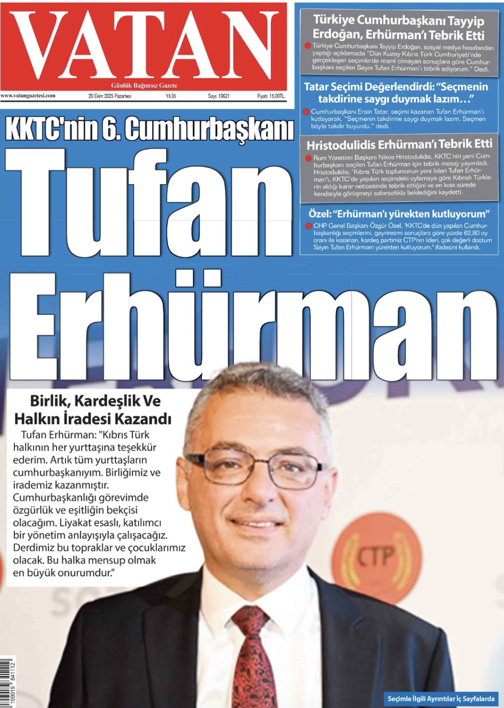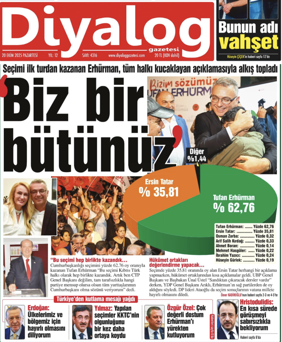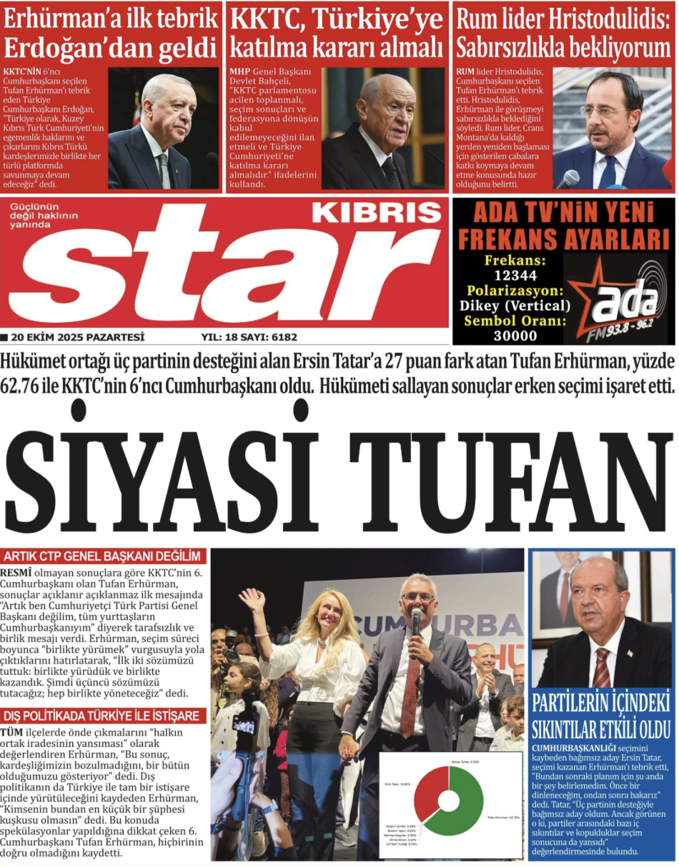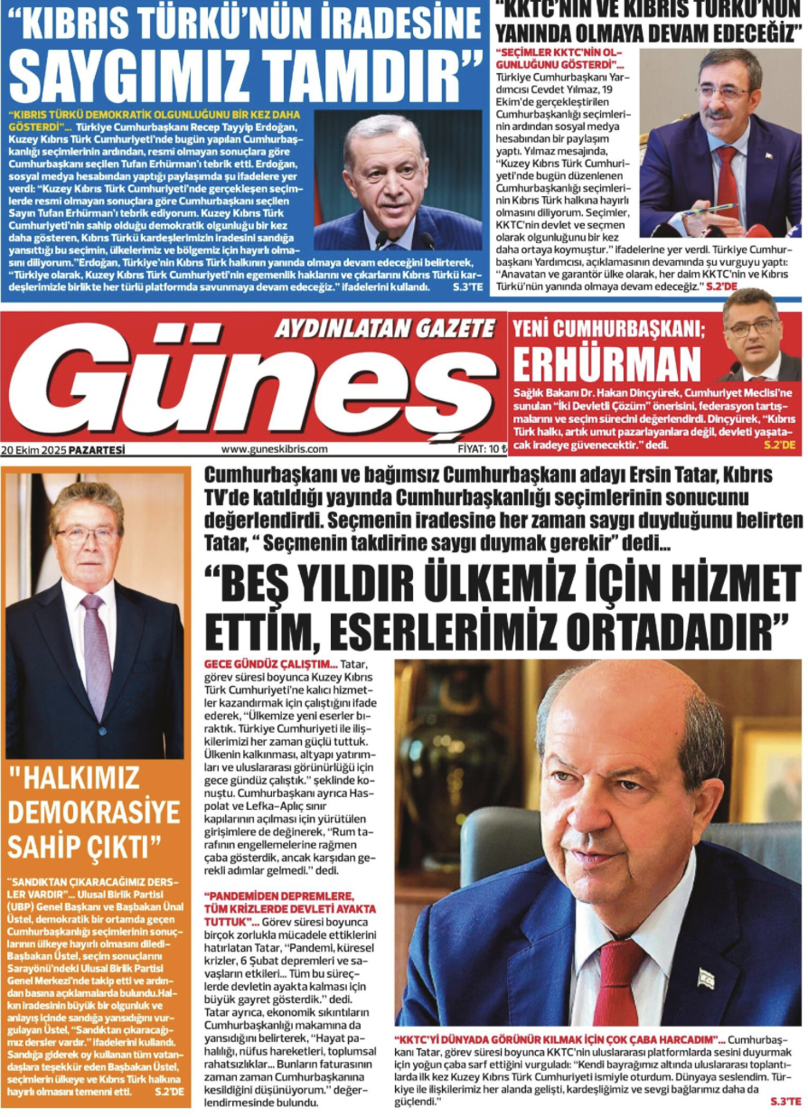 Güneş gazetesi, ilk sayfasında Cumhurbaşkanı Erdoğan, Cumhurbaşkanı Yardımcısı Cevdet Yılmaz ve seçimi kaybeden Ersin Tatar’ın açıklamalarına yer verdi.