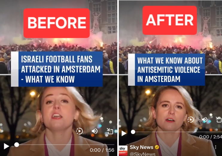 “Bu çılgınlık. Amsterdam protestolarını kapsayan bir paylaşımı gizemli bir şekilde sildikten sonra, Sky News yeni bir versiyon yayınladı. Yeni versiyon, şiddetin antisemitik olduğuna dikkat çekerek vurguyu tamamen değiştiriyor. Aşağıdaki açılış ekran görüntüsü değişikliğine bakın “
