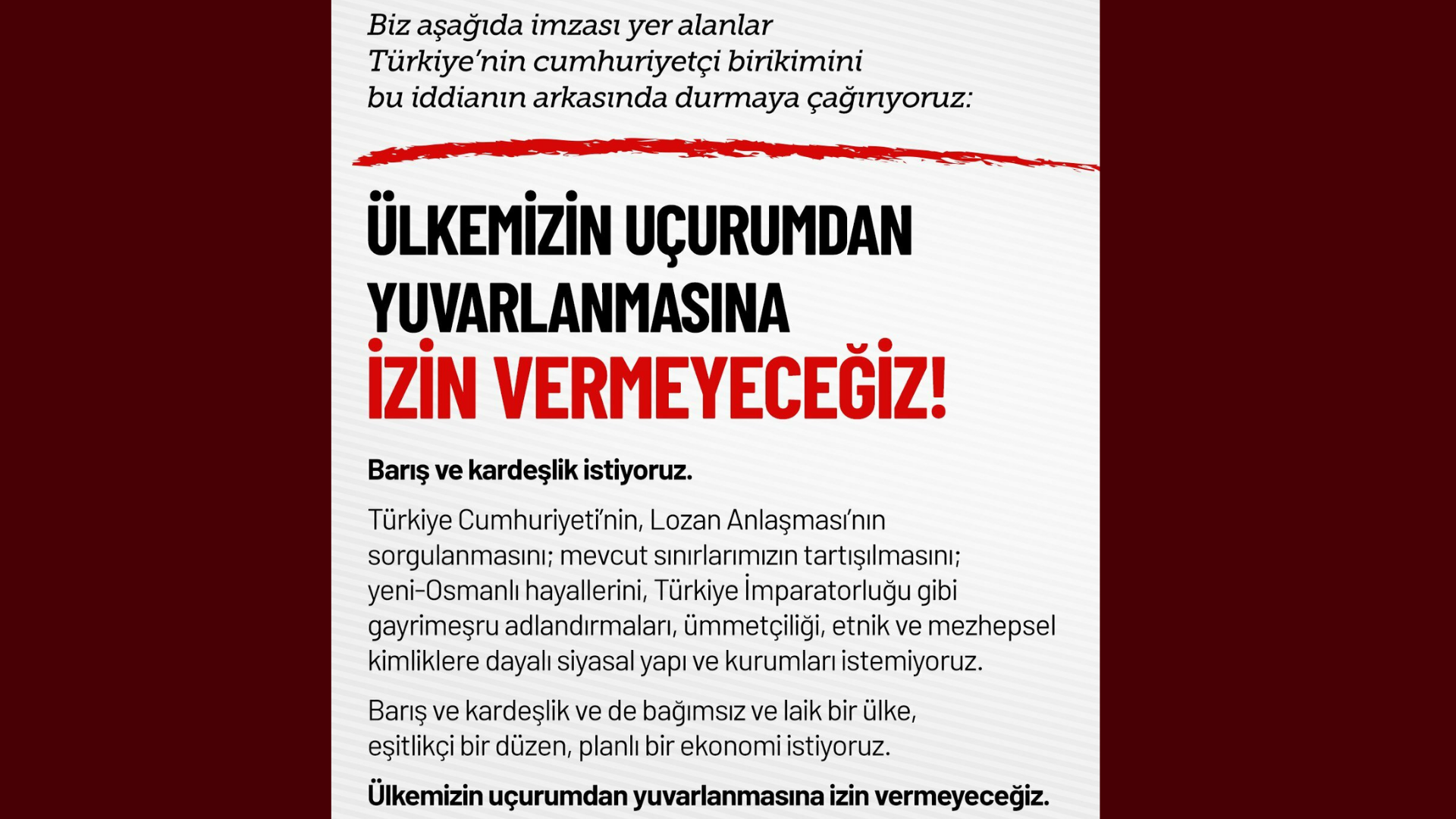 Türkiye Cumhuriyeti’nin, Lozan Anlaşması’nın sorgulanmasını; mevcut sınırlarımızın tartışılmasını; yeni-Osmanlı hayallerini, Türkiye İmparatorluğu gibi gayrimeşru adlandırmaları, ümmetçiliği, etnik ve mezhepsel kimliklere dayalı siyasal yapı ve kurumları istemiyoruz.