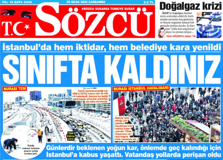 CHP’ye yakınlığı ile bilinen Sözcü gazetesi ise bugün (26 Ocak) hem belediyeyi hem iktidarı eleştiren “Sınıfta Kaldınız” manşetiyle yayımlandı.