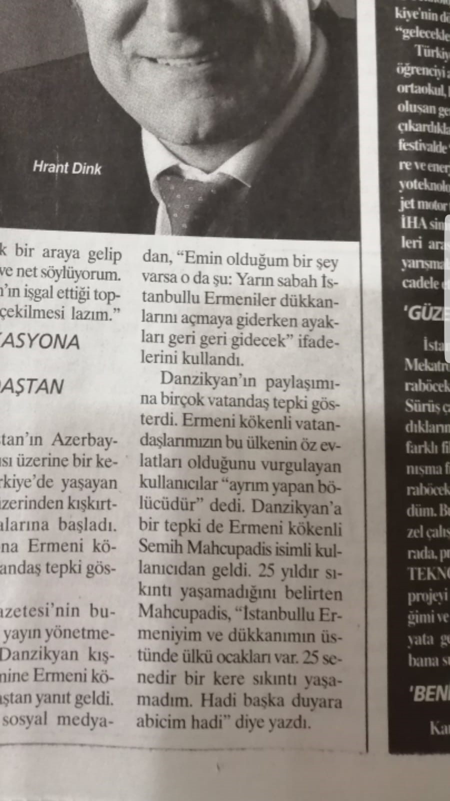 “Danzikyan’a bir tepki de Ermeni kökenli Semih Mahcupadis isimli kullanıcıdan geldi. 25 yıldır sıkıntı yaşamadığını belirten Mahcupadis, ‘İstanbullu Ermeniyim ve dükkanımın üstünde ülkü ocakları var. 25 senedir bir kere sıkıntı yaşamadım. Hadi başka duyara abicim hadi” diye yazdı.