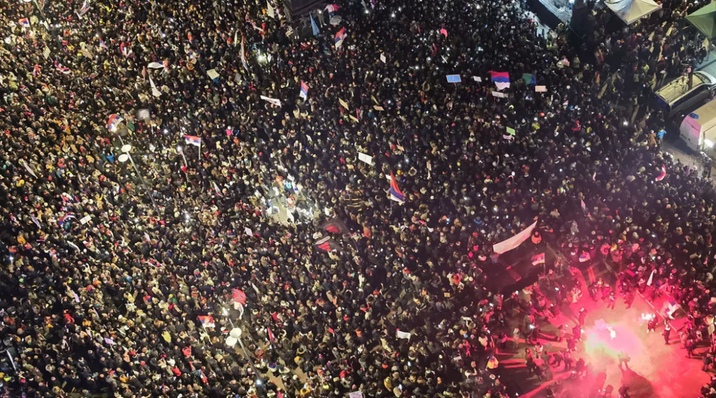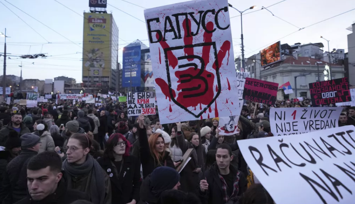 1 Kasım’da beton kirişlerinin çökmesiyle 15 kişinin hayatını kaybettiği kazanın ardından hükümete tepki gösteren halk Belgrad’daki Slavija Meydanı’nda büyük bir protesto gösterisi yaptı. Göstericiler, kazada ölen 15 kişi için 15 dakikalık saygı duruşunda bulundu, “Elleriniz kanlı”, “Vicdanınız rahat mı?” ve “Öğrenciler anlayışın sesi” yazılı dövizler taşıdı.