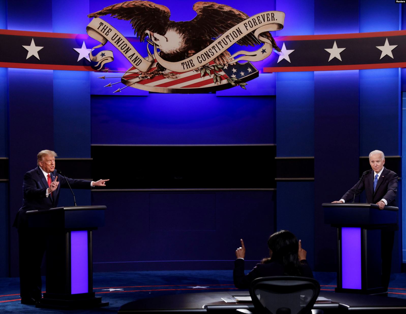 Adaylar tartışmanın ilk bölümünde moderatörün yönelttiği sorulara cevap verdikleri iki dakikalık kesintisiz sürelerini kullanırken, karşı tarafın mikrofonu kapalı kaldı. Sürecin aksamadan yürütülmesi amacıyla Trump ve Biden’ın seçim kampanyası ekibinden bir kişi, rejide sesten sorumlu görevliyi izlemek üzere sahne arkasındaydı.