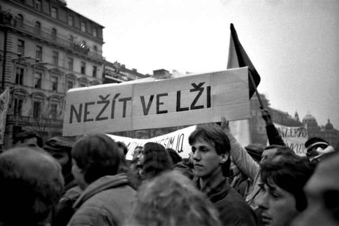 Nitekim 1989 devriminin karizmatik lideri Havel ve 1968’in devrik lideri Dubcek Melantrich binasının geniş balkonuna el ele çıkınca kendilerini aşağıda karşılayan pankartlardan biri de “Bir yalanı yaşama”ydı.