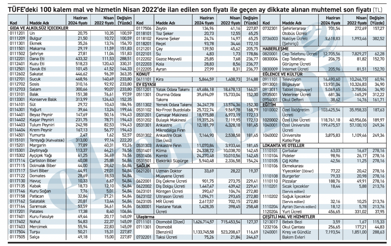 En son açıklanan Nisan 2022 ile Haziran 2024 fiyatları arasındaki çarpıcı rakamlar şu şekilde…