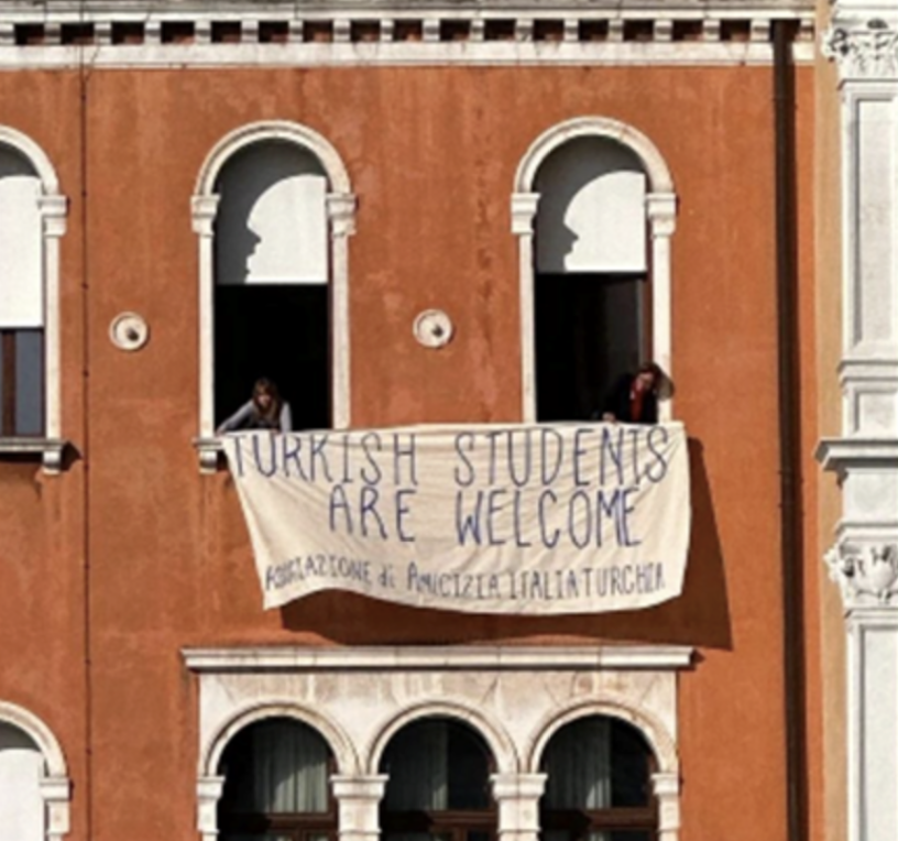 İtalya-Türkiye Dostluk Derneği üyeleri, Venedik’teki Ca’ Foscari Üniversitesi’nde Türk öğrencilerin ve velilerin protestosuna, üniversite binasına “Türk öğrenciler hoş gelsinler” yazılı pankart açarak destek vermişti.
