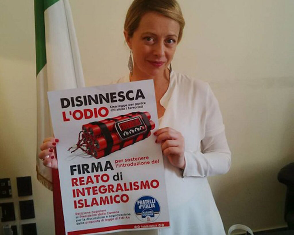 Meloni, 2016 yılında İtalyan parlamentosuna, radikal İslamcılığı suç kapsamına alan bir yasa tasarısı sunmuştu. Yasa tasarısında, ‘İslami köktendincilik’ temelli nefret vaazı verenler ve nefreti teşvik edenleri finanse edenlerin 6 yıla kadar hapse mahkum edilmesi öngörülüyordu.