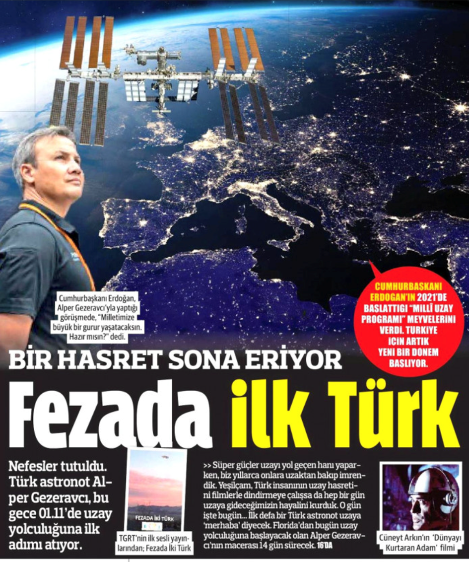 İktidara yakın gazetelerde ve televizyonlarda bugünün Türkiye açısından bir dönüm noktası olacağından, Türkiye’nin uzay programının ne kadar muhteşem olduğundan söz ediliyor.
