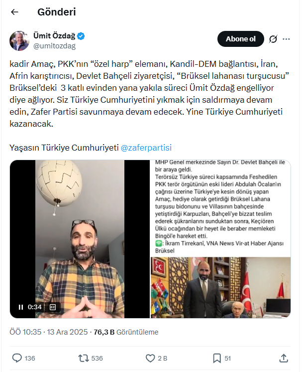 kadir Amaç, PKK’nın “özel harp” elemanı, Kandil-DEM bağlantısı, İran, Afrin karıştırıcısı, Devlet Bahçeli ziyaretçisi, “Brüksel lahanası turşucusu” Brüksel’deki 3 katlı evinden yana yakıla süreci Ümit Özdağ engelliyor diye ağlıyor. Siz Türkiye Cumhuriyetini yıkmak için…