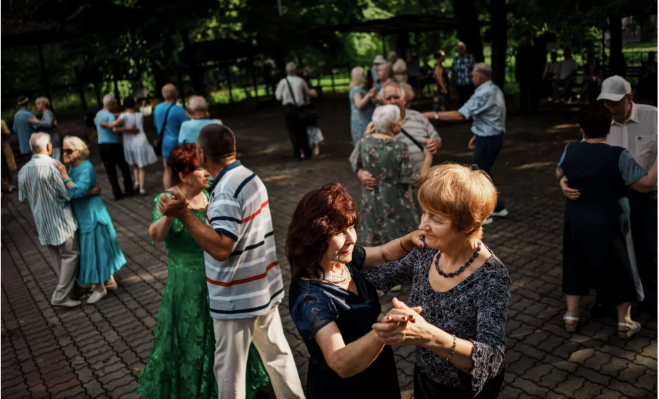 Dnipro Nehri’nin karşısında ve kuşak yelpazesinin diğer ucunda, hafta sonu akşamları Ukraynalı yaşlıların açık havada bir araya gelerek eski şarkılar eşliğinde dans etmesi, savaştan onlarca yıl öncesine dayanan bir gelenek. Kışın, dalma ve dönme hareketleri şehir merkezindeki geniş bir metro istasyonunda gerçekleşirken; yaz aylarında yaşlılar ağaçlarla gölgelenmiş bir park pavyonunu ele geçiriyor.