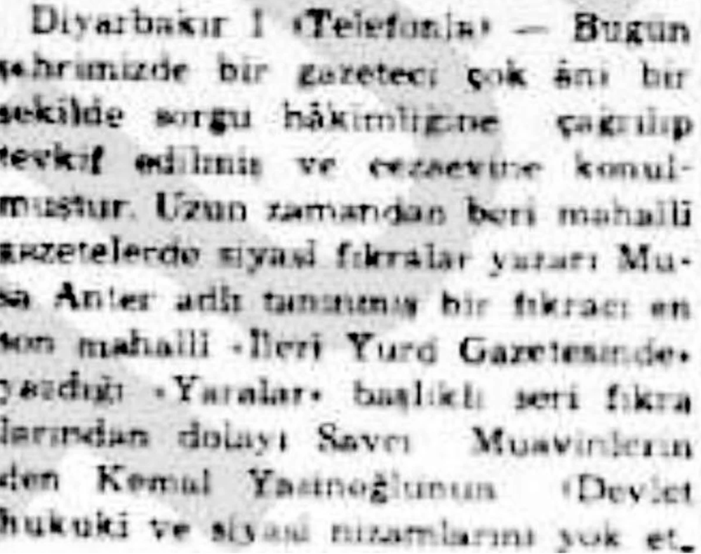 Musa Anter, Diyarbakırlı bir gazeteci olarak girdiği hapisten, Kürt meselesi üzerine yazan bir Kürt aydın olarak çıktı ve ömrünün sonuna kadar Kürt meselesi üzerine yazdı. 1992’de Diyarbakır’da öldürüldü. Davası hâlâ devam ediyor.