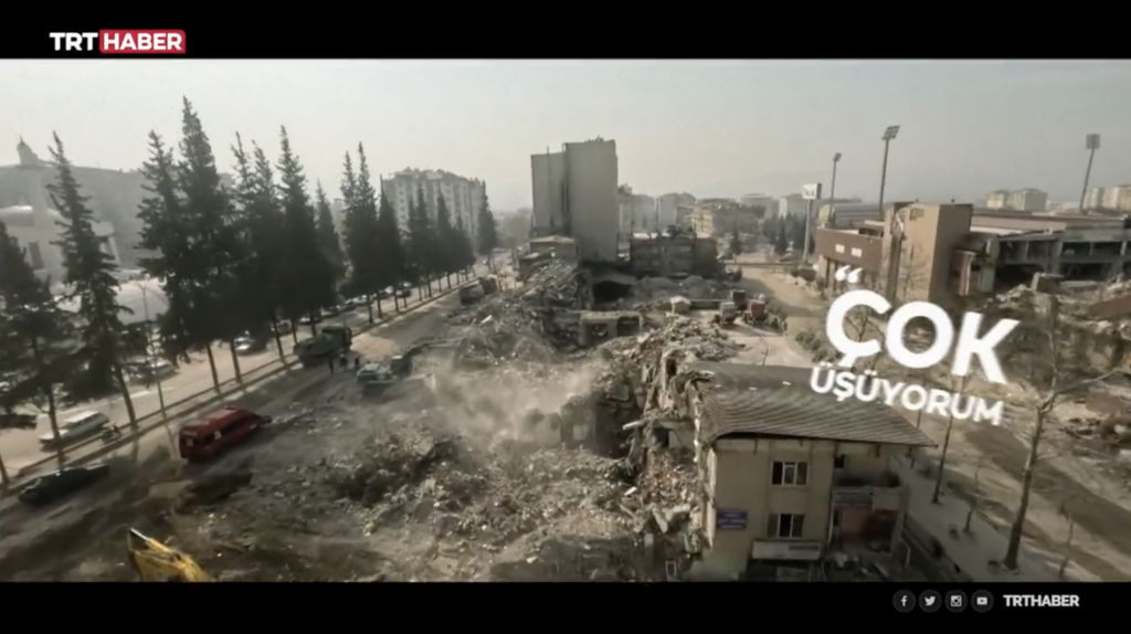 TRT'nin sosyal medya hesaplarından yayımlanan videoda enkaz kaldırma çalışmaları, enkaz altındaki insanların yardım çığlıkları ile birlikte gösterildi. Sonunda Erdoğan'ın konuştuğu video şu notla paylaşıldı: “Enkazlar temizleniyor, ‘güvenli hayat’ için yeni temeller atılıyor. İlk günden beri sahada olan devlet depremin yaralarını sarmak için tüm gücüyle çalışıyor.” Video gelen tepkiler üzerine kaldırıldı.