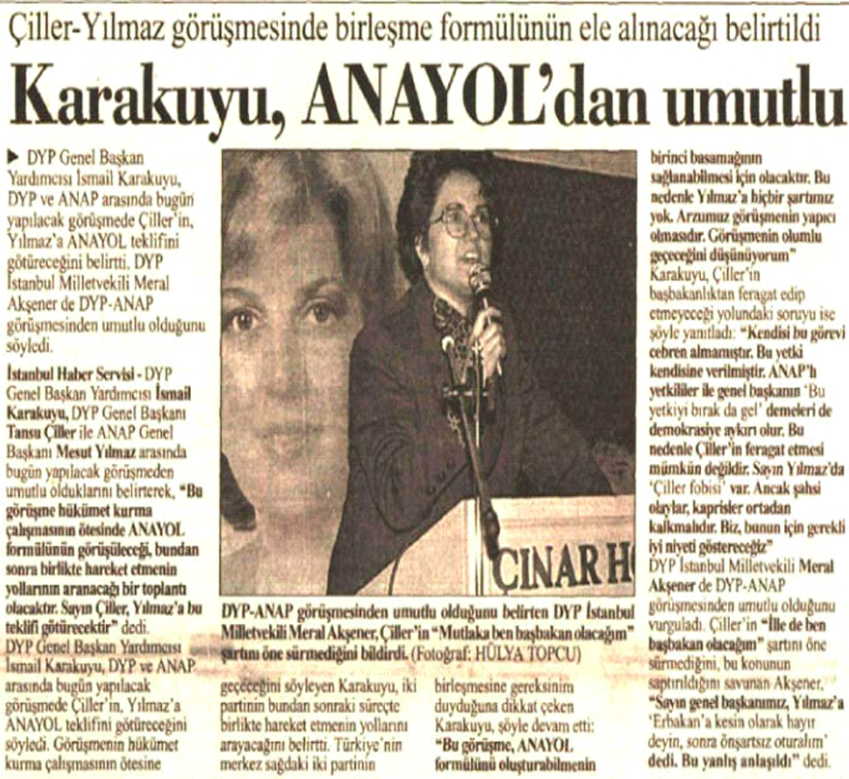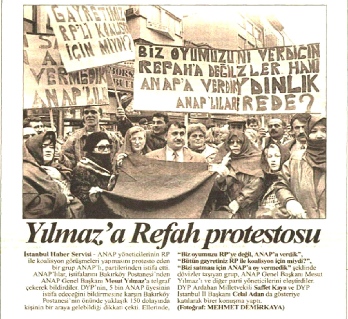 Ama gösteriler ilginçti. İstanbul Bakırköy’deki gösteri için basını DYP teşkilatı davet etmişti. ANAP’lı kadınların gösterisine DYP İstanbul İl Başkanı Celal Adan, DYP Ardahan milletvekili Saffet Kaya da katılmıştı.