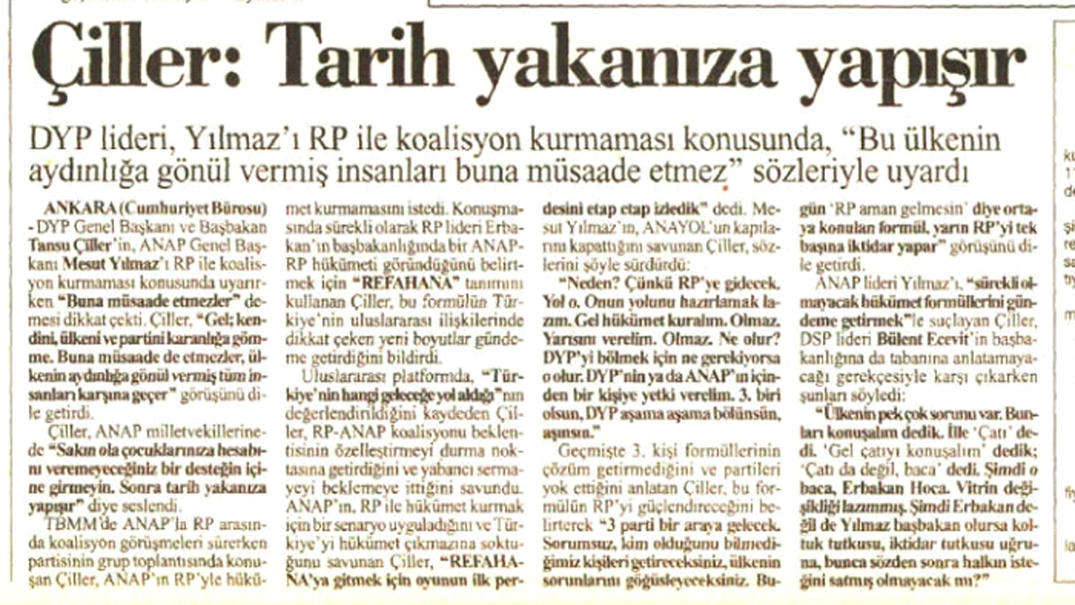 Refah ile asla koalisyon kurmam diyen Çiller’in başbakan yardımcısı, Erbakan’ın başbakan olduğu Refahyol.