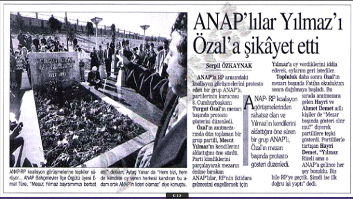 Başka bir gösteride yine ANAP’lı olduğunu söyleyen bir grup Özal’ın Anıtmezar’ına giderek Refah Partisi ile koalisyon kurmaya çalışan Yılmaz’ı Özal’a şikayet etmişti.