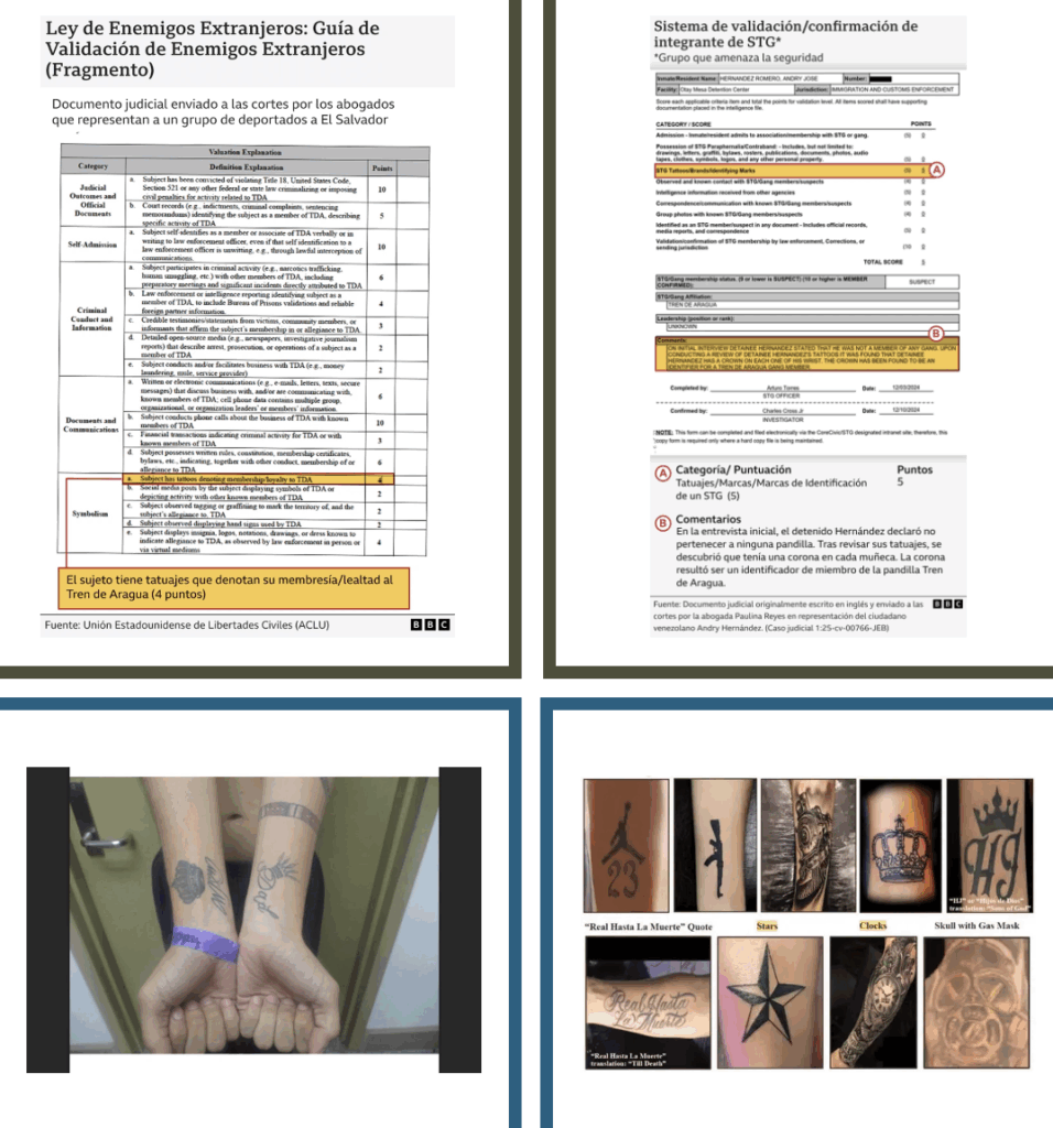 Eşcinsel kuaför Romero’yu Bukele’nin acımasız hapishanelerine düşüren ise uyuşturucu çetesi mensubu olduğuna dair somut delil değil, kolundaki dövmeler oldu. Trump yönetimi hiçbir yargı denetimi olmadan kaçak göçmenlerin dövmelerine bakıp çete üyelerinin sıklıkla kullandığı dövmeleriyle karşılaştırıyor, muğlak ve soyut bir liste kullanarak görünüşleri, saç kesimleri, dövme şekilleri, yazıları üzerinden puanlar vererek belirli bir puanın üstündeki kişileri çete üyesi olduğu gerekçesiyle sorgulamadan, somut delil aramadan, geçmişine dair sorular sormadan El Salvador hapishanelerine, toplama kamplarına yolluyor. Romero da memleketindeki bir festivalin simgesini, anne ve babasının isimlerini içeren bir kraliçe tacı dövmesi nedeniyle çete üyesi olarak değerlendirilmiş ve böylece Trump’ın göçmen polisleri eşcinsel bir kuaförü tehlikeli bir “narko terörist” olarak değerlendirip sınırdışı etmişti.