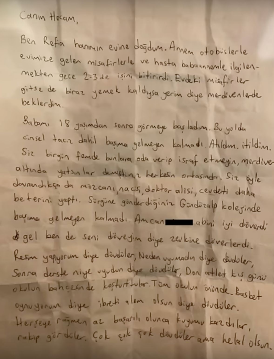 Annem otobüslerle evimize gelen misafirlerle, hasta babaannemle ilgilenmekten gece 2-3’te işini bitirirdi. Evdeki misafirler gitse de biraz yemek kaldıysa yerim diye merdivende beklerdim. Babamı 18 yaşımdan sonra görmeye başladım. Bu yolda cinsel taciz dahil başıma gelmeyen kalmadı. Atıldım. İtildim. Siz bir gün FEM’de “Bunlara oda verip israf etmeyin, merdiven altında yatsınlar” demiştiniz herkesin ortasında. Siz öyle davrandıkça da Mözcan’ı, Naci’si, Doktor Ali’si, Cevdet’i daha beterini yaptı. Sürgüne gönderdiğiniz Gündüzalp Koleji’nde başıma gelmeyen kalmadı. Amcan … abini iyi döverdi, gel ben de seni döveyim diye zevkine döverlerdi. Resim yapıyorum diye dövdüler. Neden uyumadın diye dövdüler. Sonra derste niye uyudun diye dövdüler. Don atlet kış günü okulun bahçesinde koşturdular tüm okulun önünde. Basket oynuyorum diye ibreti alem olsun diye dövdüler. Her şeye rağmen az başarılı olunca kuyumu kazdılar, rakip gördüler. Çok çok çok dövdüler ama helal olsun.