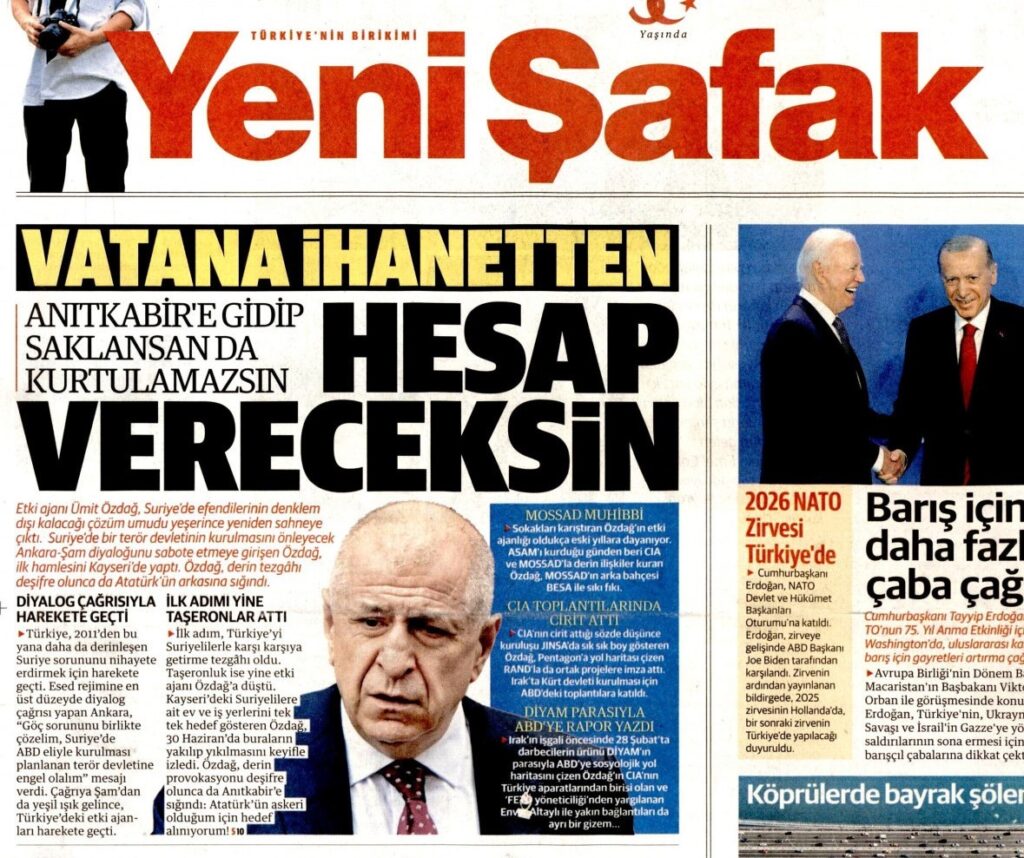 Yeni Şafak, bugünkü (11 Temmuz) birinci sayfasında Zafer Partisi Genel Başkanı Ümit Özdağ için “Vatana ihanetten hesap vereceksin” manşeti attı.