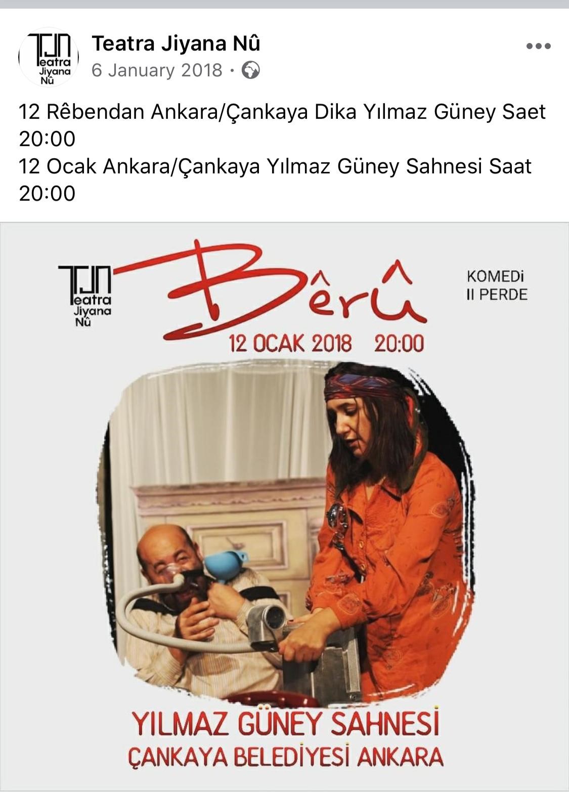 Gaziosmanpaşa Kaymakamlığı tarafından “kamu düzenini bozabileceği” gerekçesiyle yasaklanan, İstanbul Valisi ve İçişleri Bakan yardımcısının “PKK propagandası yüzünden yasaklandı” dediği, İtalyan yazar Dario Fo’nun 1981’de yazdığı eserinin Kürtçe uyarlaması olan Bêrû, 2017’den itibaren Kürtçe olarak İstanbul, Ankara, İzmir, Adana, Diyarbakır ve Batman’da 100’den fazla kez sahnelenmiş. İBB Başkanı Ekrem İmamoğlu: "Kırmızı bülten ile aranan bir teröristi televizyona çıkarmak serbest. Kürtçe oyun oynatmak yasak, suç. Böyle bir şey olmaz."