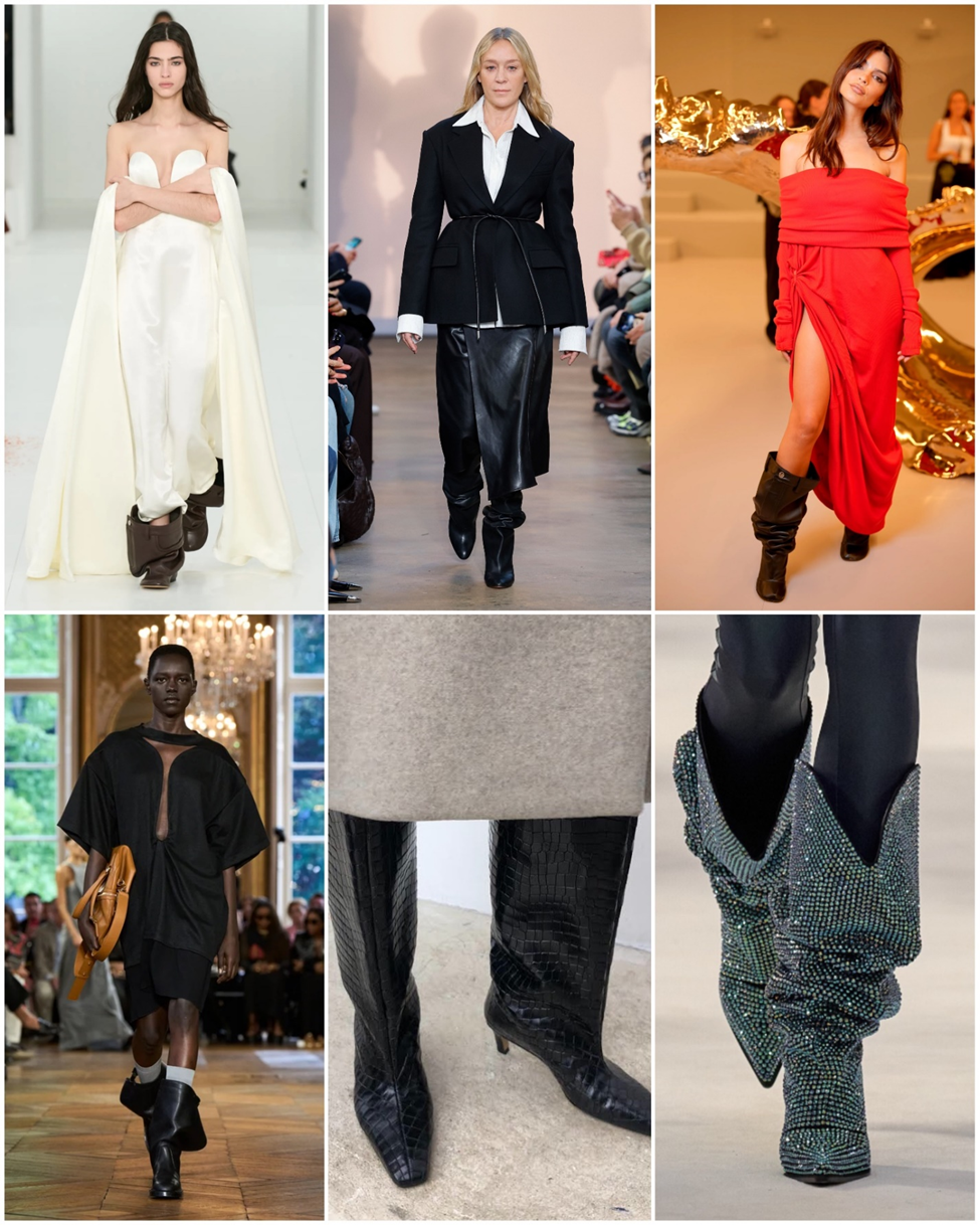2017’de YSL’in taşlarla kaplı 10.000 dolar etiketli botları (Rihanna’nın da etkisiyle) ortalığı sarsmıştı. Daha sonra 2020’de Alexandre Vauthier’nin couture koleksiyonlarında dikkat çeken bol ve bilekte yığılan botlar yavaş ve istikrarlı şekilde yükseldi ve Mary Jane pabuçlarla birlikte 2024’ün ayakkabı trendlerinde zirveye oturdu. Bu tarz bol ve yığılan çizmeler aslında ilk olarak 80’lerde Vivienne Westwood’un korsanlardan esinlenen tasarımlarıyla podyumlara çıktı. Yine son yılların yükselen İskandinav markası Totême’in biraz daha sakin tasarımlı, alçak topuklu, krokodil baskılı geniş bilekli çizmeleri bu trendin en popüler modellerinden oldu.